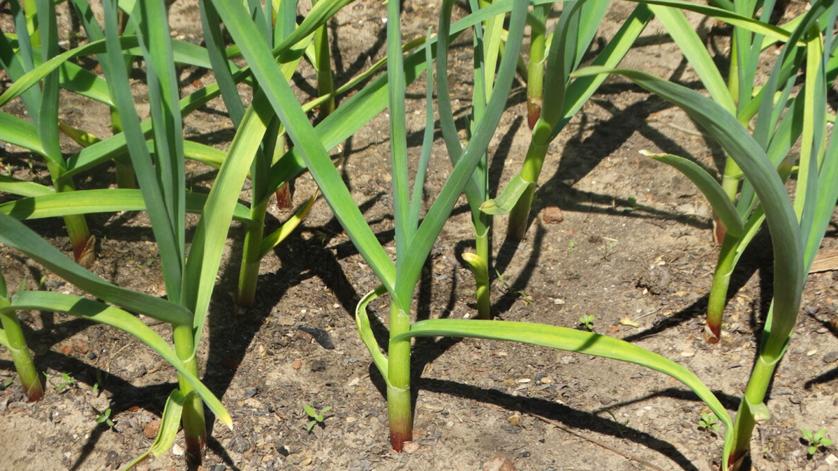 Прошло две недели. Лист чеснока стал плотным, тёмно-зелёным, блестящим. Пошла мощь. Видно, что растение довольное. Луковица стала как будто подталкивать почву. Земля приподнимается, как от картофеля.