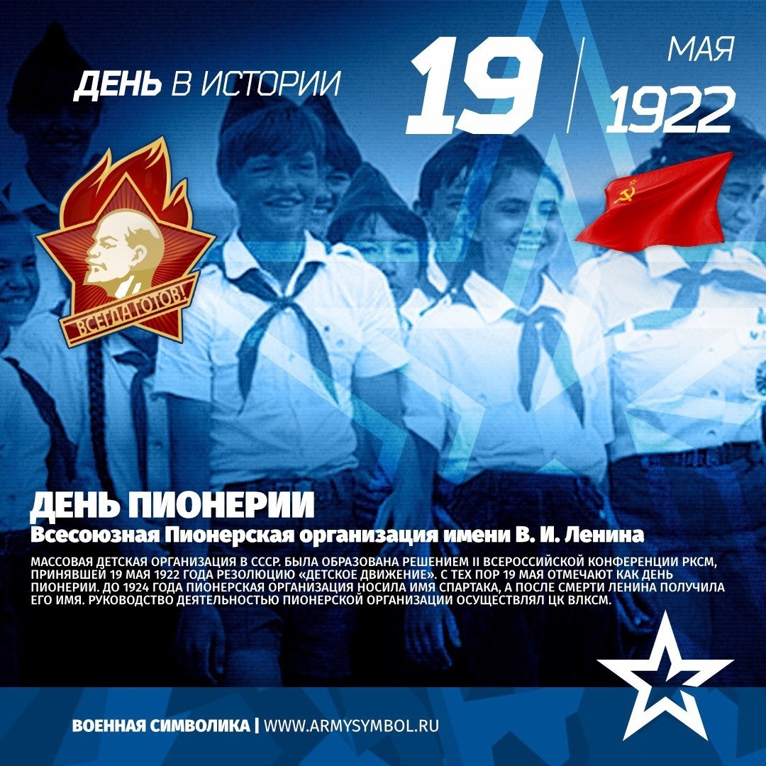 День Пионерии с 1922 Всесоюзная Пионерская организация имени В.И. Ленина Массовая детская организация в СССР. Была образована решением II Всероссийской конференции РКСМ, принявшей 19 мая 1922 года резолюцию «Детское движение». С тех пор 19 мая отмечают как День пионерии. До 1924 года пионерская организация носила имя Спартака, а после смерти Ленина получила его имя. Руководство деятельностью пионерской организации осуществлял ЦК ВЛКСМ. #ПамятныеДатыВоеннойИсторииОтечества #ДеньВИстории #ГодЗащитникаОтечества #80ЛетВеликойПобеды Источник: https://vk.com/wall-60767131_30679 Подпишитесь на наши группы ВКонтакте и в Одноклассниках - читайте, смотрите и комментируйте! Источник