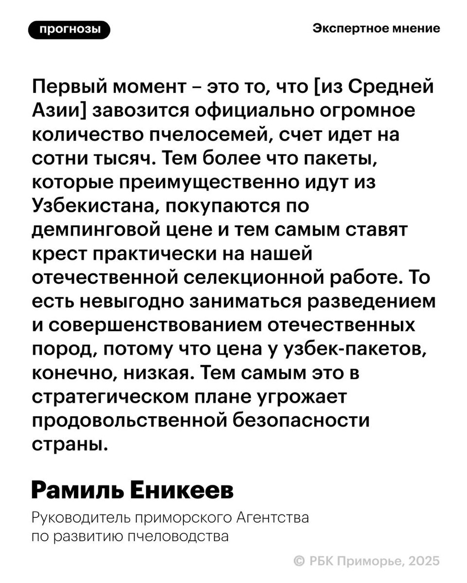 😀😀😀 Пчелы-мигранты ставят крест на российской селекции Об этом РБК Приморье рассказал руководитель регионального Агентства по развитию пчеловодства Рамиль Еникеев. По его словам, существенную угрозу для отрасли представляет импорт пчел из Средней Азии, а также увеличение фальсифицированного меда в торговых сетях. Кроме того, импортные пчелы не проходят в достаточной мере ветеринарный контроль. Как рассказал Еникеев, после массовой гибели насекомых в 2023 году выяснилось, что в ДФО появилось пять новых, ранее не регистрировавшихся вирусов. Пчеловоды связывают это как раз с поступлением пакетов пчел из Средней Азии. 🍱Подписывайтесь на РБК Восток