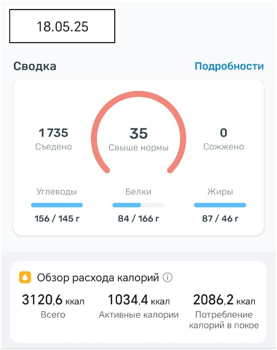 📊 Итоги вчерашнего дня. 🗓 18.05.25 💪 День ведения блога: 130 ➕ Съедено: 1735 ккал ➖ Расход (покой) : 1751 ккал ➖ Расход (активный) : 1034 ккал 🟰 Итог: -1050 ккал за день. Оценка дня: "Хорошо" 👍 Для дня отдыха от тренировок получилось очень достойно на мой взгляд! *️⃣Цифра "осталось" на фото - это сколько ещё можно съесть, чтобы выйти в 0 за день. Но мы будем считать дневной расход в покое по цифре, которую выдают весы. Мне кажется, что весы учитывают больше параметров и там цифра расхода калорий в покое точнее. 🤔 На мой взгляд для оптимального похудения "+..." - это "Слабак, сдался?" "- <1000" -это "Можно было и лучше" "- 1000" - это "Хорошо" "- 1500" - это "Отлично" "-2500" - это "Жесть я машина! Главное не помереть!" Так что, такую систему оценки и введем! ✍️ Пишите свои калории за день! #калориии_за_день 😎 Roman Legas | Life