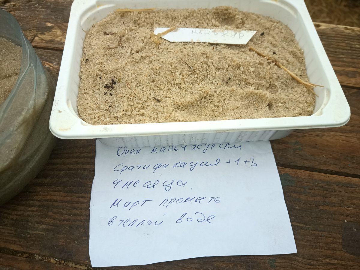 В качестве эксперимента, осенью были приобретены орехи в количестве 10 шт. Как я писал ранее, всхожесть любых орехов, никогда не будет 100%. Поэтому приобретать 2-3 ореха не имеет смыслы, т.к. объем работы по их подготовке что 20-ю орехами что с 3-мя примерно одинаков. Необходимы: 1. Емкость (подложка от продуктов), в днище прокалываем отверстия для дренажа 2. Песок (желательно обработанный кипятком). Песок влажный, но не мокрый. Сигналом, что песок подходит является подходящим по влажности будет перестающая капать из дренажных отверстий вода. 3. Полиэтиленовый пакет. В него помещается емкость. 4. Емкость помещается в погреб, где температура в зимнее время в диапазоне от 3,5 до 5,5 градусов. В справочнике нашел информацию по стратификации, там все просто. Единственное, что я не промывал в теплой воде. Температурный режим аналогичен тому, в котором стратифицировались грецкие грехи, только отсутствует процесс замачивание в горячей воде. В результате нахождения в погребе с 25 октября по