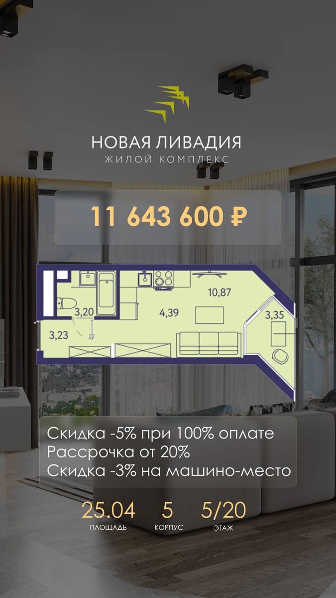 Уютная квартира 25,04 м² с панорамным видом на Ялту и Черное море. Идеально для ценителей комфорта 🌅 Преимущества ЖК «Новая Ливадия»: 💠 Открытый бассейн; 💠 Современный СПА-комплекс; 💠 Ландшафтный парк для прогулок; 💠 Закрытая территория для безопасности; 💠 Развита инфраструктура: магазины и кафе. Инвестиция в будущее: 💰Стоимость недвижимости растет всегда. 📈Стабильный доход от аренды. Специальные предложения: ⭐Скидка 5% при 100% оплате; ⭐ Рассрочка от 20% первоначального взноса; ⭐ Скидка 3% на машино-место. Не упустите шанс! Забронируйте: 📞 +7 978 177 0377