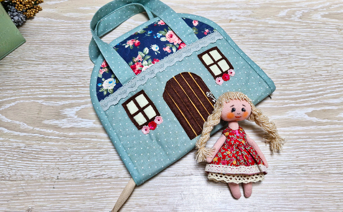 Сумочка-домик для миниатюрной, текстильной куколки.Отличное занятие для ребенка в дороге или дома.