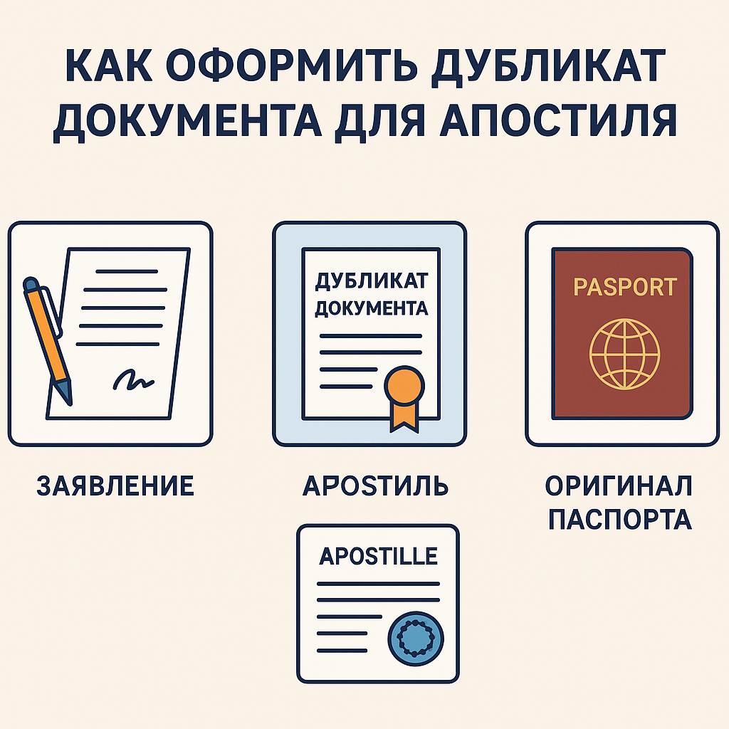 Апостиль можно поставить только на оригинал документа, а не на копию. Если оригинал утерян, сильно испорчен (например, размыт водой или порван), либо на нём уже стоит апостиль и вам он нужен второй раз — потребуется дубликат. Только он будет признан подлинным и подходящим для апостилирования. Вот список наиболее частых случаев, с которыми к нам обращаются: Иногда запрос направляют в архив, если документ был выдан более 10–15 лет назад. В каждом конкретном случае — свои нюансы. Для физических лиц: Для юридических лиц (например, если нужен дубликат устава, лицензии и т.д.): Сроки зависят от ведомства. В среднем: Если документ нужен срочно, можно попробовать ускоренное оформление (дополнительно оплачивается, не всегда доступно). После того как вы получили дубликат, его можно подать на апостилирование. Вот общий порядок действий: ❓ Могут ли отказать в апостиле, если это дубликат?