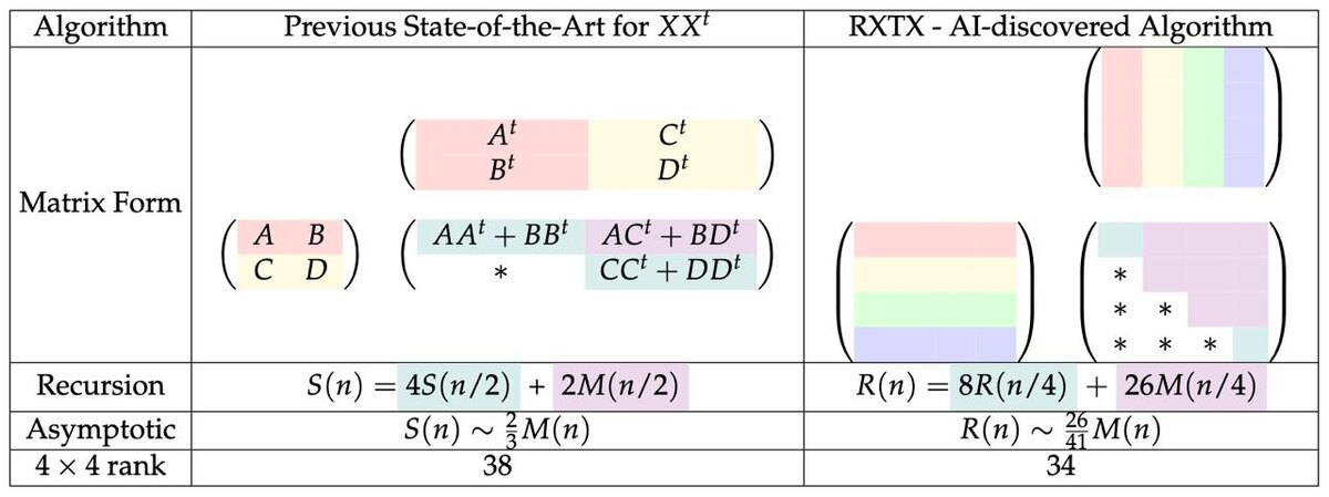 недавно вышла статья, которая для этого нашего AI несет очень много пользы, а именно 5% экономии на вычислениях я думаю, что все в курсе, что весь ИИ - это по факту перемножение матриц, например, в архитектуре трансформер механизм внимания требует 5 матричных умножений на одну голову, плюс еще одно для полносвязного слоя; другие операции - это суммирование и нормализация, которые асимптотически пренебрежимы ну так вот, авторы статьи с помощью RL перебрали возможные вариации представления умножения матриц и нашли ускоренный; графически он представлен на первой картинке, а на второй картинке сравнение количества вычислений с оптимальным алгоритмом - рекурсивным алгоритмом Штрассена (аШ); до размера 256 используется т.н. наивное умножение (как и в современных реализациях аШ), т.к. оно эффективнее на малых размерах, а дальше уже новонайденный алгоритм, дающий 5% преимущества перед аШ P.S. на моей памяти это первая статья, где - судя по имени - наш соотечественник имеет аффилиацию китайс