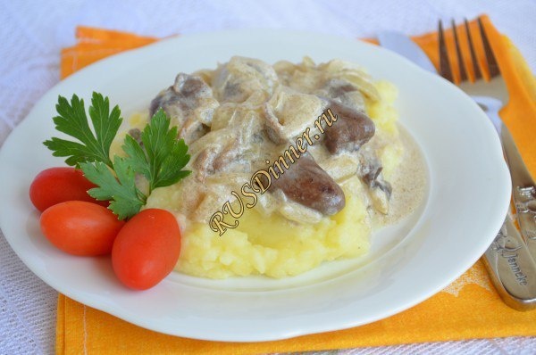 Куриные сердечки в сливочном соусе Ингредиенты: Куриные сердечки - 1000 гр. Лук репчатый - 4 шт. Сливки - 200 мл. Соль - 7 гр. Перец черный молотый - 5 гр. Грибы шампиньоны - 500 гр. (в моем случае были замороженные) Масло растительное - 40 мл. Источник: https://rusdinner.ru/page/kurinye-serdechki-v-slivochnom-souse