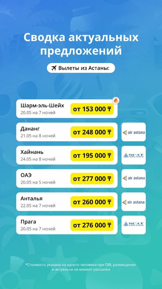 *Стоимость указана на одного человека при DBL размещении и актуальна на момент рассылки Для бронирования +77778088706