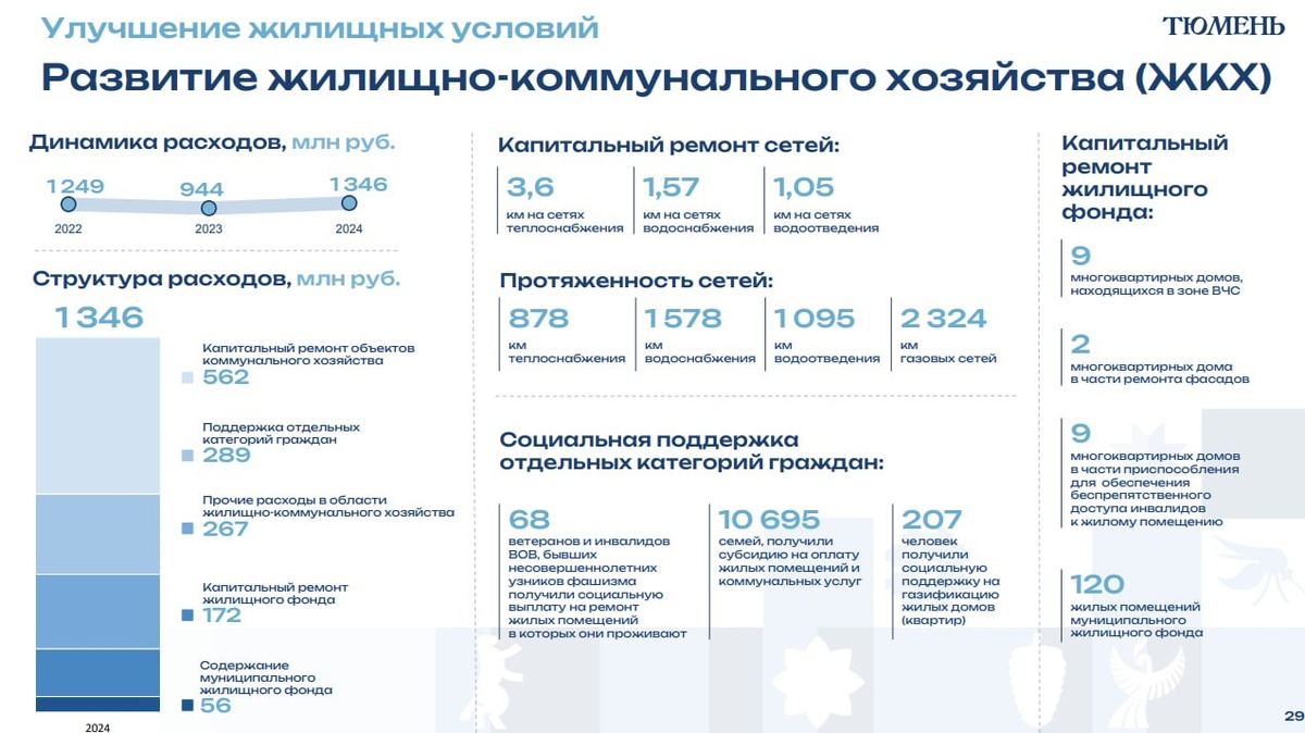 Тюменское ЖКХ-2024 в цифрах Во время публичного обсуждения отчёта об исполнении бюджета за прошлый год директор департамента финансов и налоговой политики администрации Тюмени Артем Катренко поделился основными финансовыми результатами в сфере ЖКХ. Расходы на ЖКХ увеличились по сравнению с 2023 годом. Большая часть средств направлена на капитальный ремонт и модернизацию коммунальных объектов. В том числе проведена замена сетей во дворах, которые попали в программу благоустройства. Эти работы выполняются перед преображением дворов, чтобы минимизировать возможные инциденты на сетях на обновлённых территориях. В 2024 году во дворах Тюмени проведена замена сетей: - 3, 6 км — теплоснабжения; - 1, 57 км — водоснабжения; - 1, 05 — водоотведения. Добавим, что кроме этого в прошлом году ресурсоснабжающие организации провели ремонт и реконструкцию инженерных коммуникаций и объектов ЖКХ по всему городу. 298 млн рублей из бюджета направлены по поддержку отдельных категорий тюменцев.