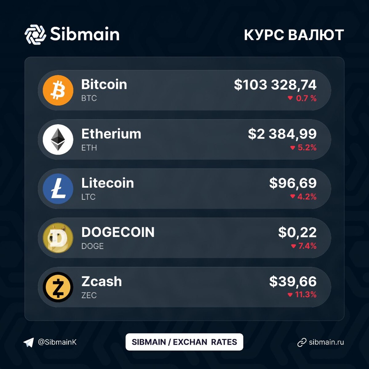 📍 Курс основных криптовалют на 19.05.2025 —————— ➡️ Интересно узнать сколько приносят Ваши майнеры? Для возможности расчета публикуем актуальные курсы криптовалют на сегодня. 💽 Sibmain предоставляет комплексные решения для майнинга под ключ. Вы можете купить, взять в лизинг оборудование для майнинга и разместить их в нашем дата-центре. Sibmain комплексные решения для майнинга под ключ! - Поставки майнинг оборудования - Дата-центр в Красноярске 80 МВт - Размещение от 5 руб/кВтч ⌨️ Нужна консультация или помощь в подборе оборудования? Звоните: +7(800)3511470 📍 г. Москва Калужская площадь д.1 к.1 💬 WhatsApp 💬 @Sibmain_salesbot 🌐 sibmain.ru