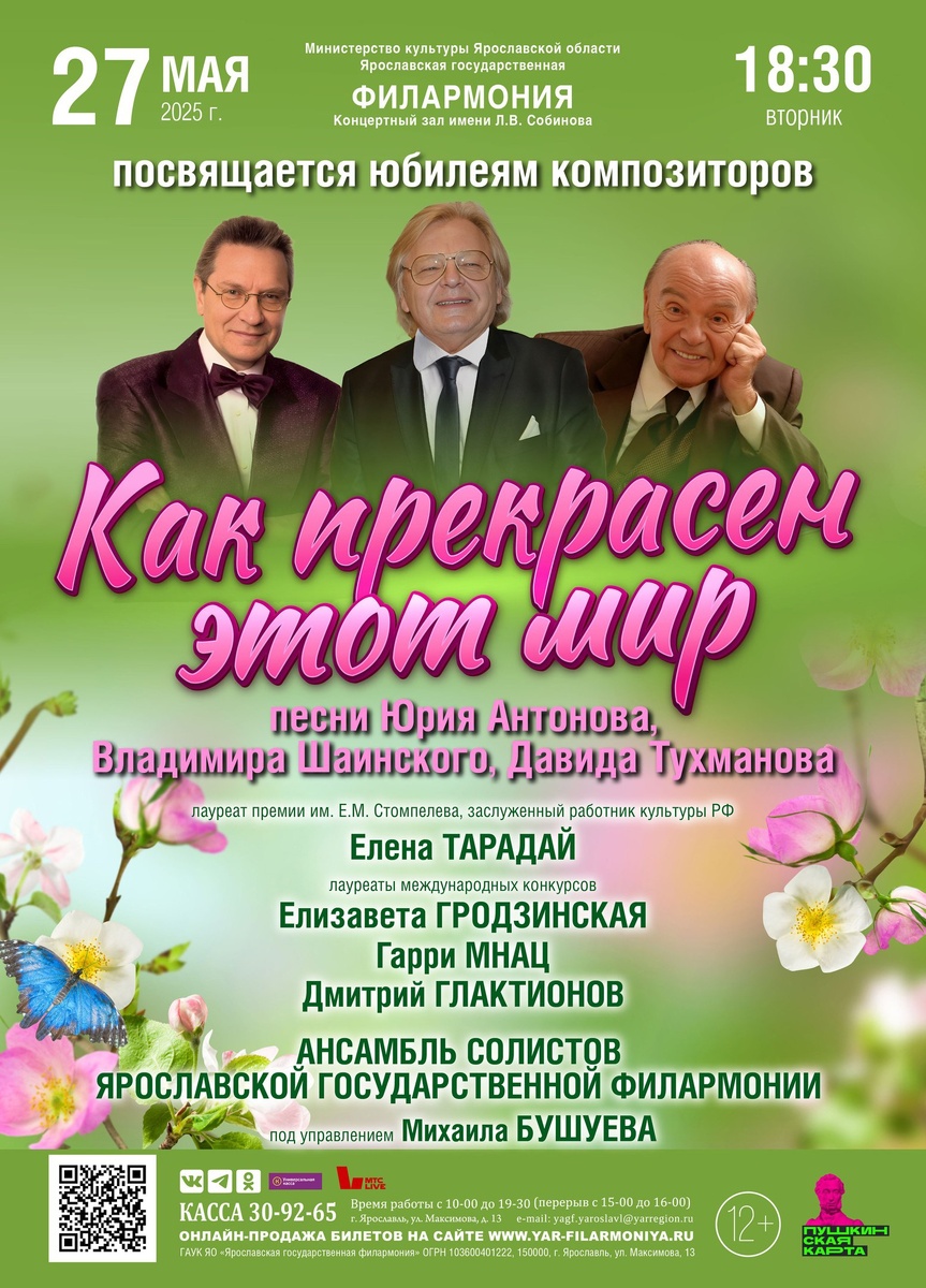 Друзья! Кому последние билетики? https://clck.ru/3KnNQB В этом году Юрий Антонов отмечает свой 80-летний юбилей, Владимиру Шаинскому исполнилось бы 100 лет, Давиду Тухманову – 85 лет. 27 мая 2025 г. в 18:30 приглашаем на концерт «Как прекрасен этот мир», в программе которого прозвучат известные песни этих композиторов. Они стали хитами для многих поколений, а их проникновенные тексты о любви, дружбе, мечтах, красоте окружающего мира не теряют своей актуальности. Программу исполнят артисты филармонии – лауреат премии им. Е.М. Стомпелева, заслуженный работник культуры РФ Елена Тарадай, лауреаты международных конкурсов Елизавета Гродзинская, Гарри Мнац, Дмитрий Глактионов и Ансамбль солистов Ярославской государственной филармонии под управлением Михаила Бушуева. Концерт «Как прекрасен этот мир» – это возможность отдохнуть от повседневной суеты, насладиться любимыми мелодиями и почувствовать, насколько красива жизнь, когда в ней есть музыка! https://yar-filarmoniya.ru/afisha/buy.php?af_id