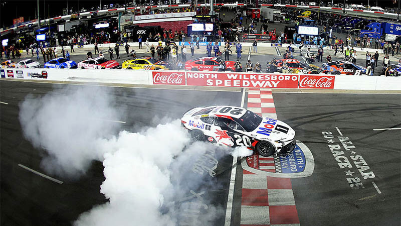 Небо озарилось фейерверками, а из-под шин машины «Toyota» #20 от «Joe Gibbs Racing» вырвался дым, когда Кристофер Белл праздновал свою первую победу в гонке всех звезд NASCAR на трассе North Wilkesboro Speedway. Белл вылез из машины под овации. Забудьте об этом — практически все на переполненных трибунах уже стояли на последних 28 кругах зеленого флага, когда Белл бок о бок сражался с Джоуи Логано и, наконец, оторвался от победителя прошлого года и вырвался вперед на 241 круге из 250. На тот момент у Белла были лучшие шины с правой стороны, чем у Логано, который остался на трассе под желтым флагом от промоутера, вынесенного неофициальным флагманом Майклом Уолтрипом на 215-м круге. Белл заменил две шины под желтым флагом, вернулся в гонку шестым на 223-м круге позади пяти оставшихся на трассе машин и быстро поднялся на второе место, обойдя Росса Честейна на 227-м круге. С этого момента игра началась для Белла, который неустанно преследовал Логано. На 241-м круге Белл поравнялся с Логано