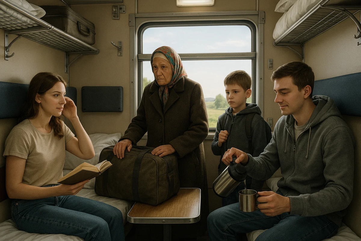 Дверь купе открылась с лёгким скрежетом. На пороге стояла пожилая женщина в ярком платке, с массивной сумкой в руках. Она была с мальчиком лет десяти, который держал в руках рюкзак, почти такой же, как и он сам.