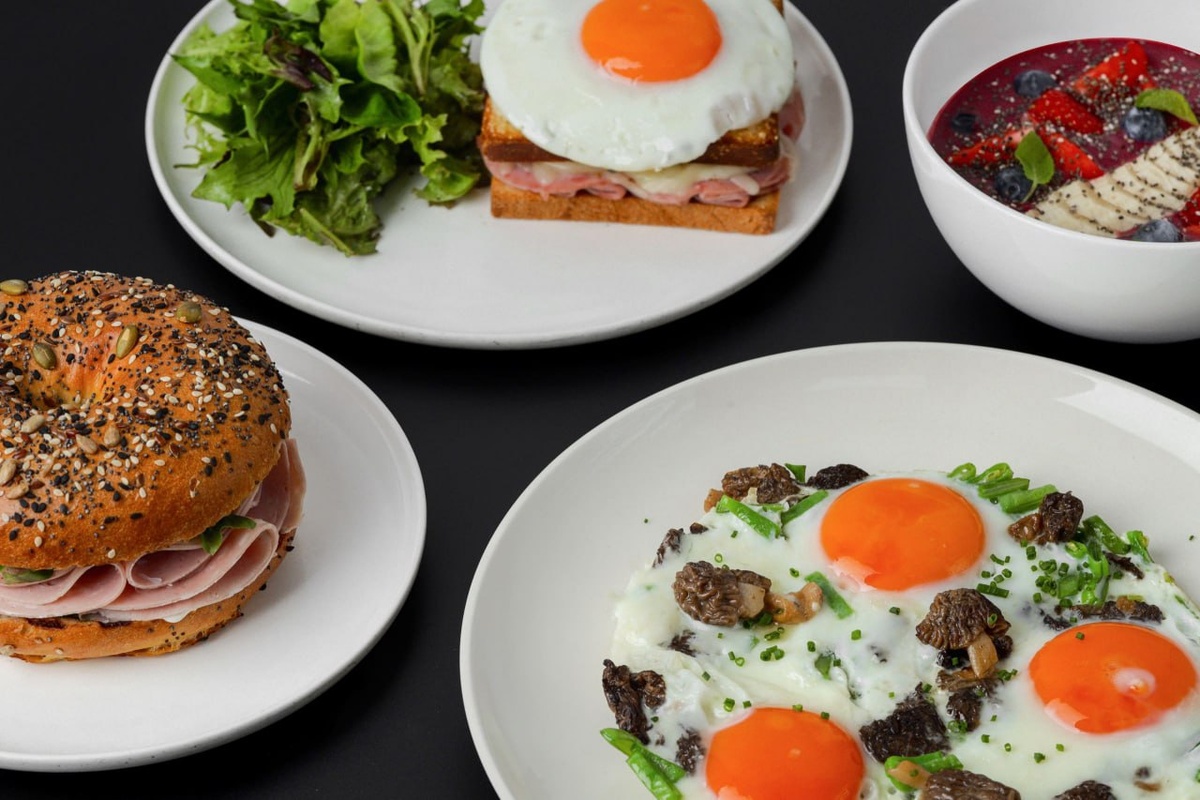 Сырники, крок-месье с тунцом и крок-мадам с ветчиной, бейгл с мортаделлой и страчателлой, драники из батата с яйцом пашот и лососем и