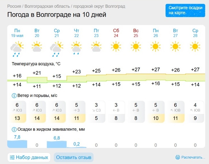 По информации погодного центра «Фобос», в первую половину семидневки температурный режим будет характеризоваться как сравнительно прохладный. Но очень быстро все сегодняшние тучи рассеются, и прохлада резко сменится почти на 30-градусную жару — в низовьях Волги до +27: