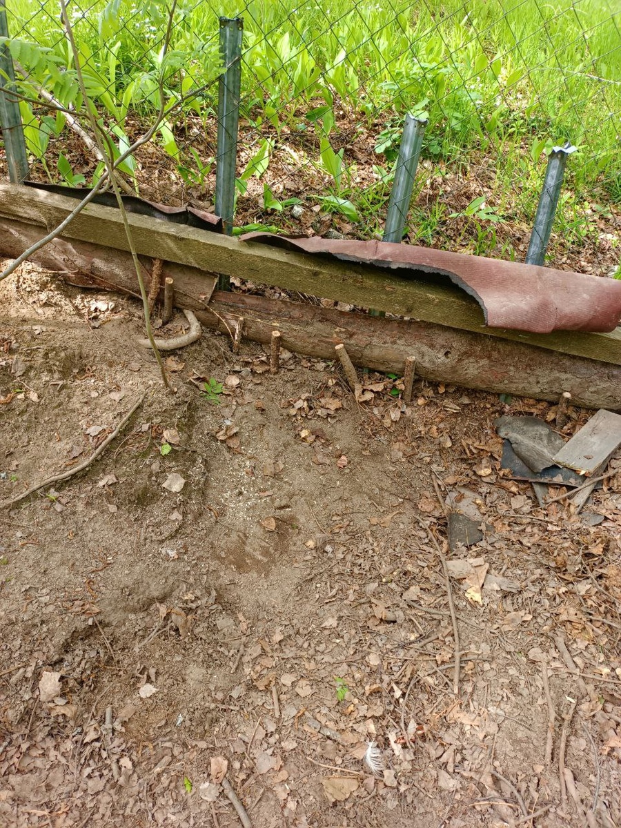 Далее, в субботу, занялся частью забора у оврага, угол участка. Одна из кур нашли способ там выбираться наружу, за периметр. Пришлось повозиться. Пассатижами скрутить сетку по низу. Пилой горбыль распилить на куски, чтоб минимизировать расстояние до земли, тут уклон же. В общем закрыл и даже если рыть — не обвалиться и вылезти тут уже нельзя.