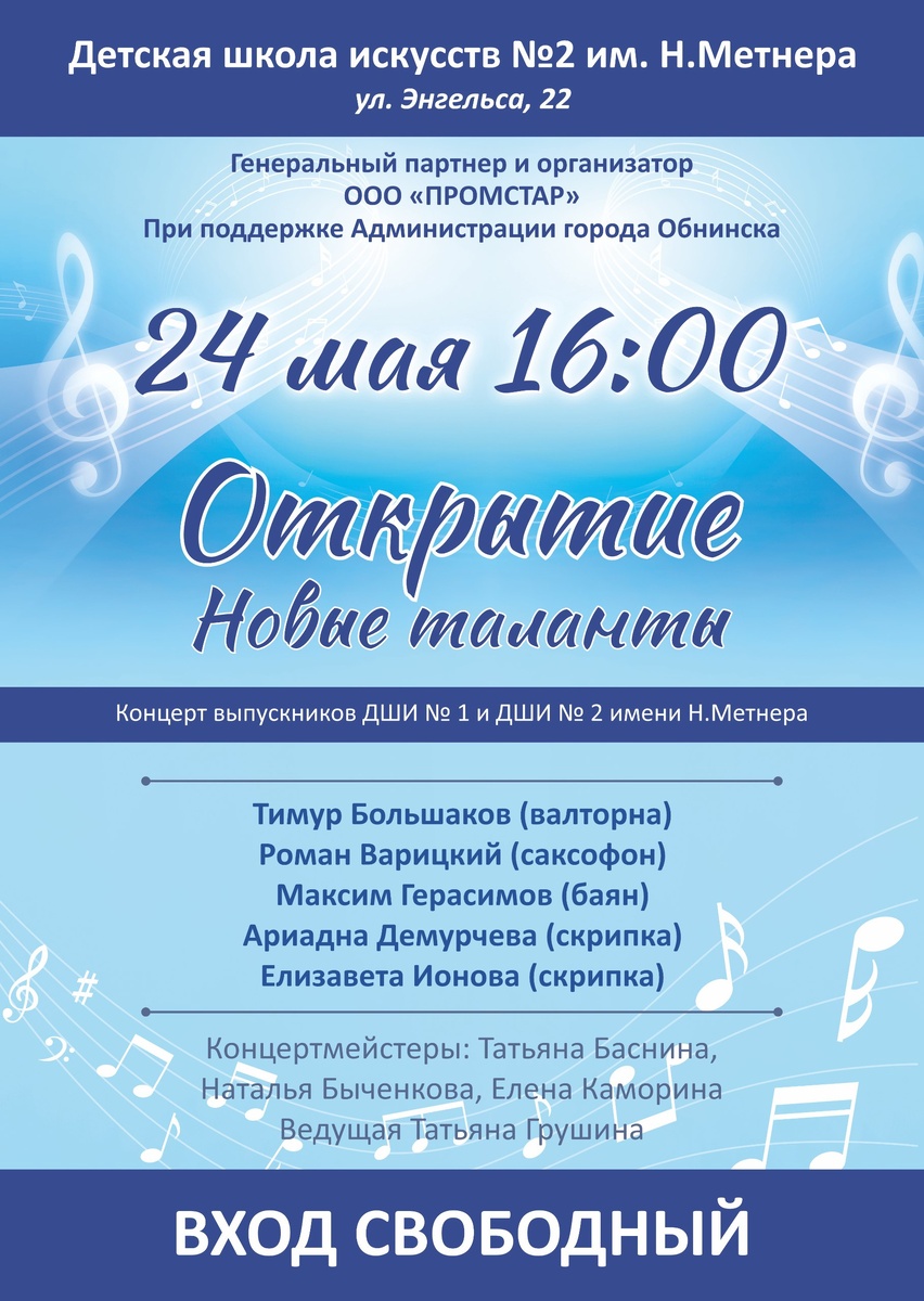 🎶24 мая в 16:00 в концертном зале ДШИ №2 им. Н. Метнера в Обнинске состоится концерт в рамках музыкального проекта «Открытие». Открываем новые таланты! На сцене выступят лауреаты международных конкурсов – лучшие выпускники музыкальных школ города Обнинска: Тимур Большаков (валторна), Роман Варицкий (саксофон), Ариадна Демурчева (скрипка), Елизавета Ионова (скрипка) и калужанин Максим Герасимов (баян). Вход свободный. Обнинск, ул. Энгельса, 22 👍 Подписаться | Прислать мероприятие
