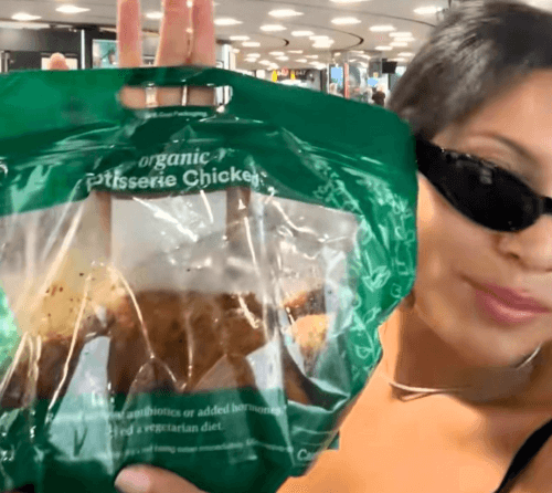 те блюда, которые подаются во время полётов. И на сей раз путешественница решила прихватить целую тушку курицы в