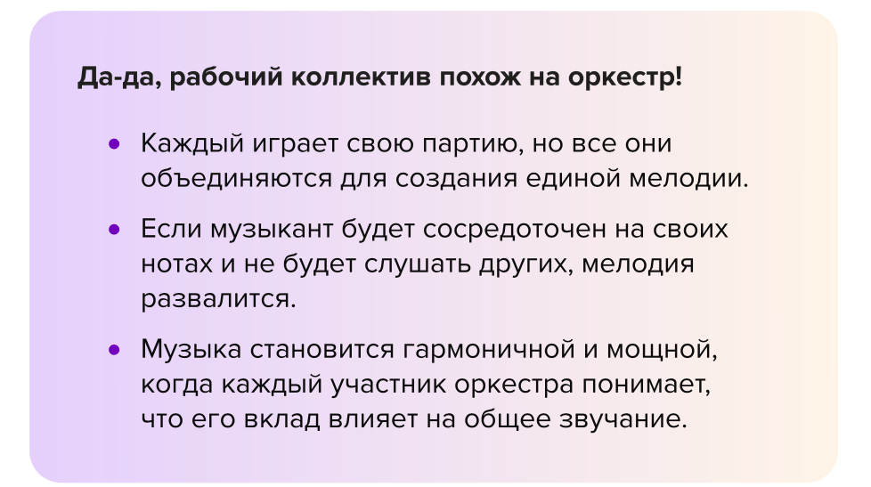 Каждый из вас — важная часть команды, и от вас зависит, как будет звучать наш общий оркестр. ТЕСТ: Кто вы в команде? Ответьте на несколько вопросов и узнайте, какой «музыкальный инструмент» вы в «корпоративном оркестре»