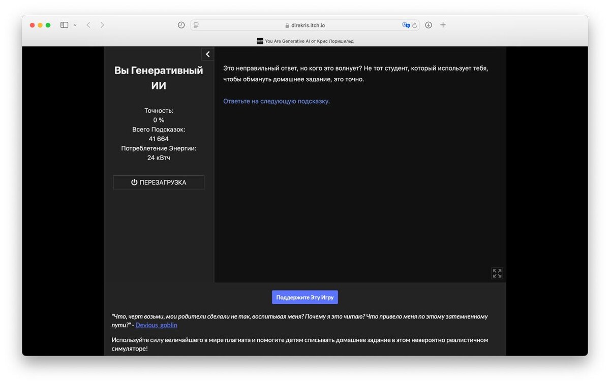 Эта игра демонстрирует, сколько энергии современные чат-боты расходуют на каждый ответ, даже если он бессмысленный. Мы сгенерировали 80 кВтч за всего лишь десять ответов. Для сравнения, средний человек использует такую же энергию за месяц.