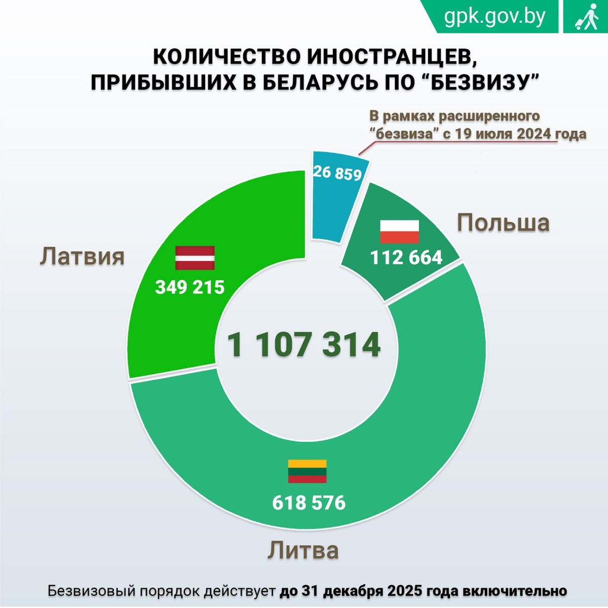 Всего с 15 апреля 2022 года нашу страну посетили 1 107 314 жителей Европы. Из Латвии прибыло 349 215 иностранцев, из Литвы – 618 576, из Польши – 112 664. В рамках расширенного «безвиза» для 35 европейских государств с 19 июля 2024 года в Беларусь проследовало 26 859 иностранных граждан.