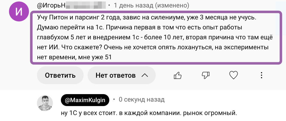 Вот почему я стараюсь никогда не давать советы. "Учу Питон и парсинг 2 года, завис на силениуме, уже 3 месяца не учусь. Думаю перейти на 1с. Причина первая в том что есть опыт работы главбухом 5 лет и внедрением 1с - более 10 лет, вторая причина что там ещё нет ИИ. Что скажете? Очень не хочется опять лохануться, на эксперименты нет времени, мне уже 51" Как тут что-то посоветовать, если скажешь, ошибешься, а человек потом будет страдать... Фиг знает чем в 51 год начинать заниматься. Иногда кажется, что в это время пора заканчивать :) Русский ИТ бизнес