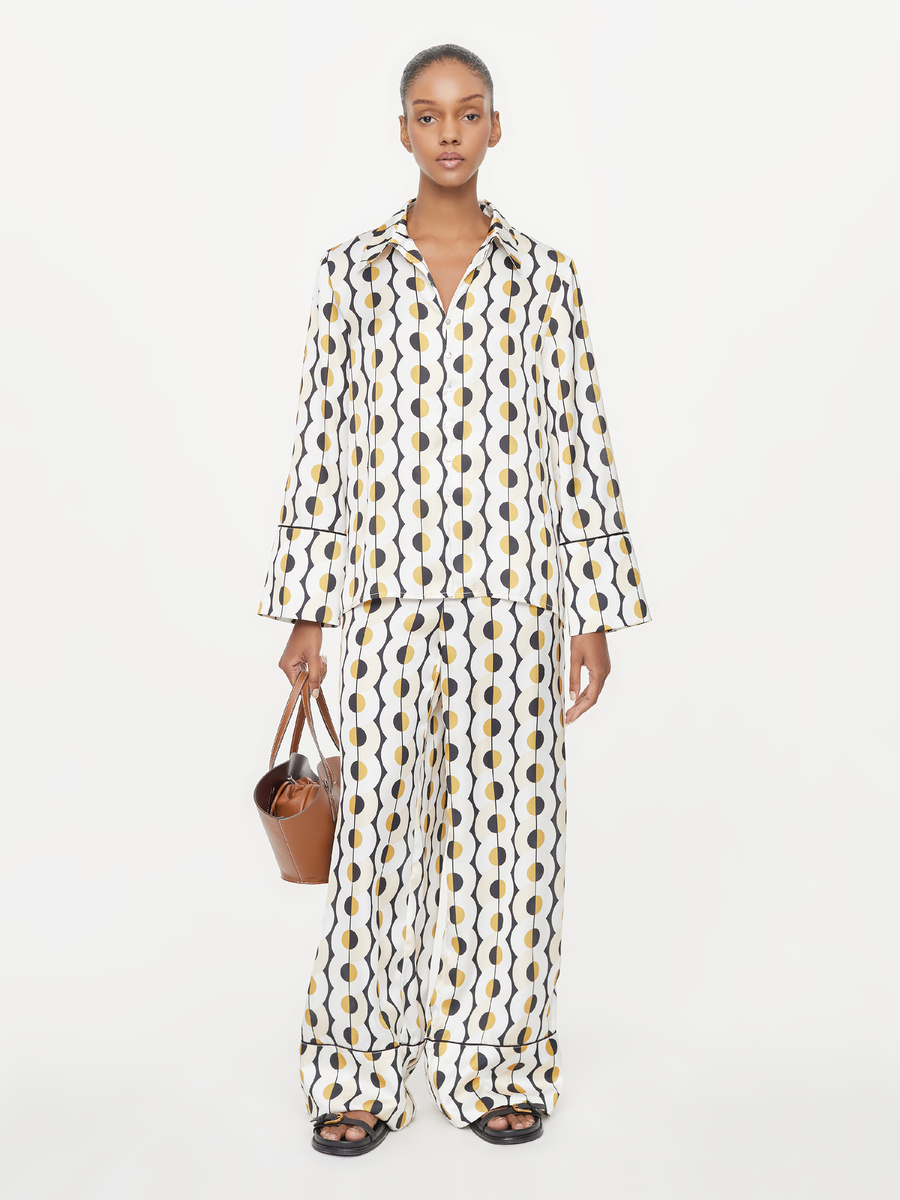 Жизнерадостный комплект в пижамном стиле с сатиновым блеском. В составе 100 % полиэстер, не для всех это минус, поэтому воздерживаюсь от критики. Главное - крой свободный актуальный, можно носить отдельно и не только летом, и красивый современный принт.