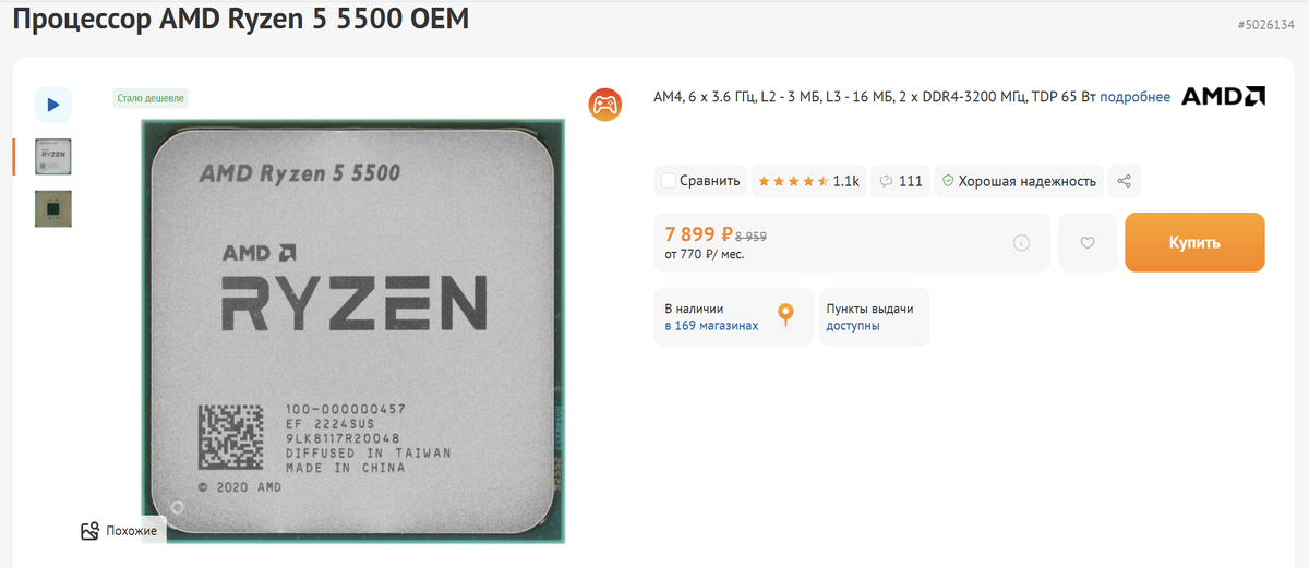 Так как нам нужно экономить, брать актуальные Core Ultra или Ryzen 9000 мы не будем — ограничивает бюджет. С другой стороны, их выход явно способствует снижению цены на процессоры предыдущих поколений, в нашем случае — Ryzen 5 5500. Достаточно производительный 6-ядерник на сокете AM4, с частотой 3,8 ГГц и 16 мегабайтами кэша третьего уровня.