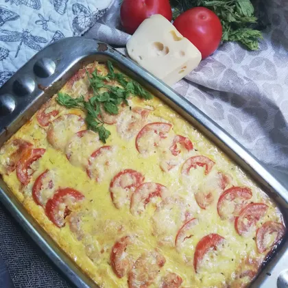 6. Помидоры раскладываем поверх кабачков в форме ровными рядами. Заливку ещё раз перемешиваем в миске и выливаем сверху. Посыпаем сыром и отправляем в заранее разогретую до 180° духовку.