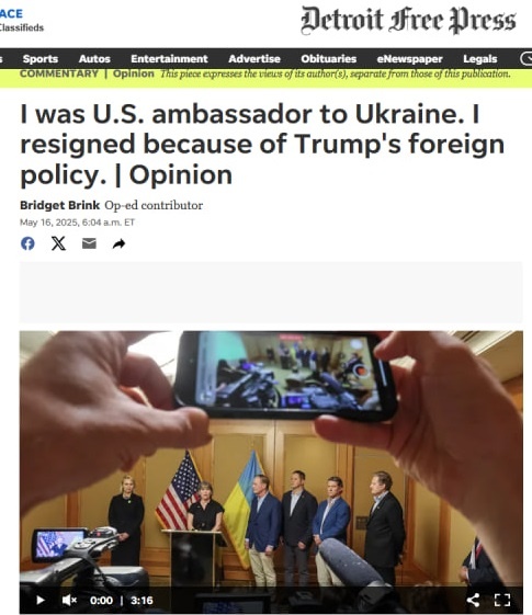 Бывшая посол США в Украине Бриджит Бринк, вернувшись на родину после увольнения с дипломатической службы, опубиковала колонку для издания Detroit Free Press, вызодящего в ее родном городе в штате Мичиган. В тексте она заявила, что действительно ушла в отставку из-за несогласия с политикой президента США Дональда Трампа в отношении Киева и Москвы. В колонке она отметила, что уважает право лидера Соединенных Штатов определять внешнюю политику страны ― «с учетом должных сдержек и противовесов со стороны Конгресса». Роль американской дипломатической службы, по ее мнению, заключается в соблюдении этой политики. Бринк похвалилась, что была дипломатом почти 30 лет при пяти президентах США — и демократах, и республиканцах. «Я с гордостью служила пяти президентам — республиканцам и демократам — чтобы гарантировать, что Соединенные Штаты являются самой сильной, величайшей страной, которую когда-либо знал мир. К сожалению, политика с самого начала администрации Трампа заключалась в оказании давле