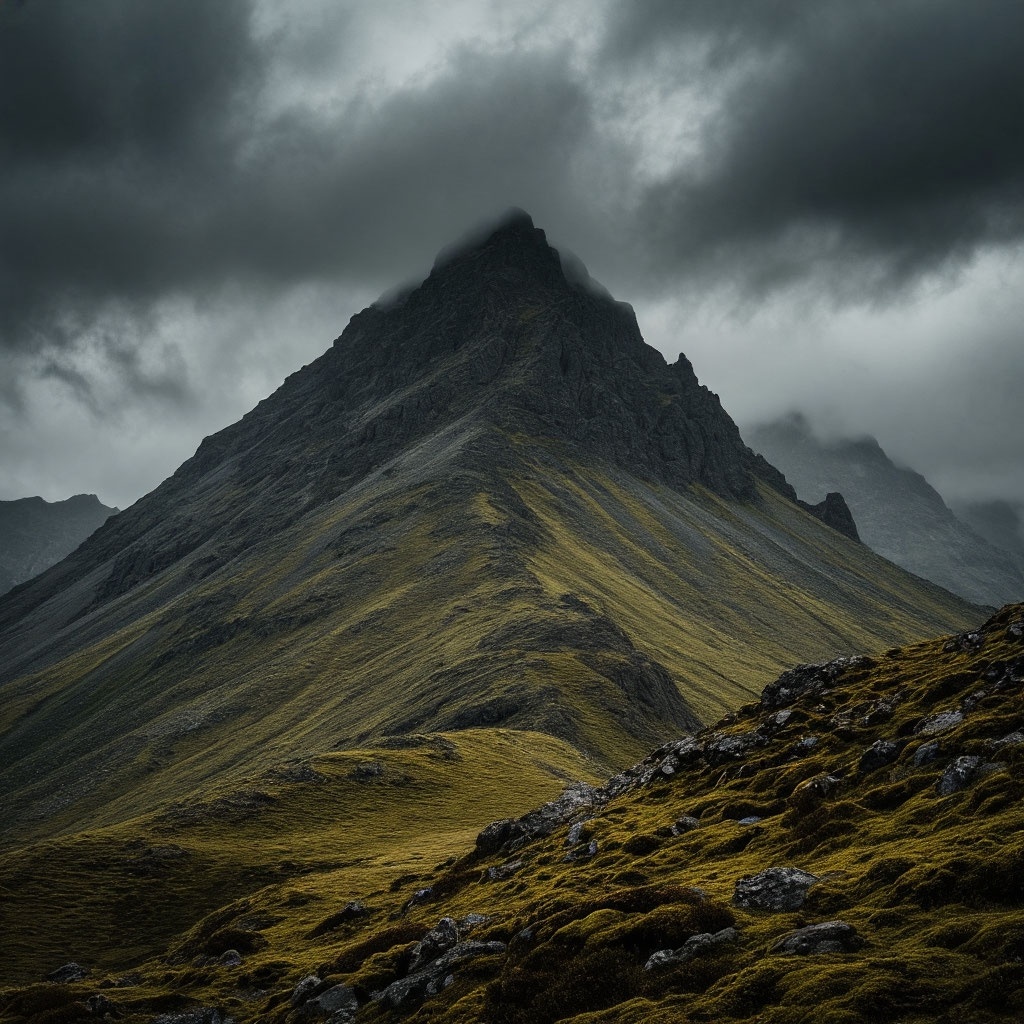 На вершине горы раскинулась каменная пустошь, где огромные валуны сложены в причудливые композиции. Эти сейды, словно древние стражи, наблюдают за каждым, кто осмеливается подняться сюда. В воздухе витает странное напряжение, будто сама природа здесь затаила дыхание.