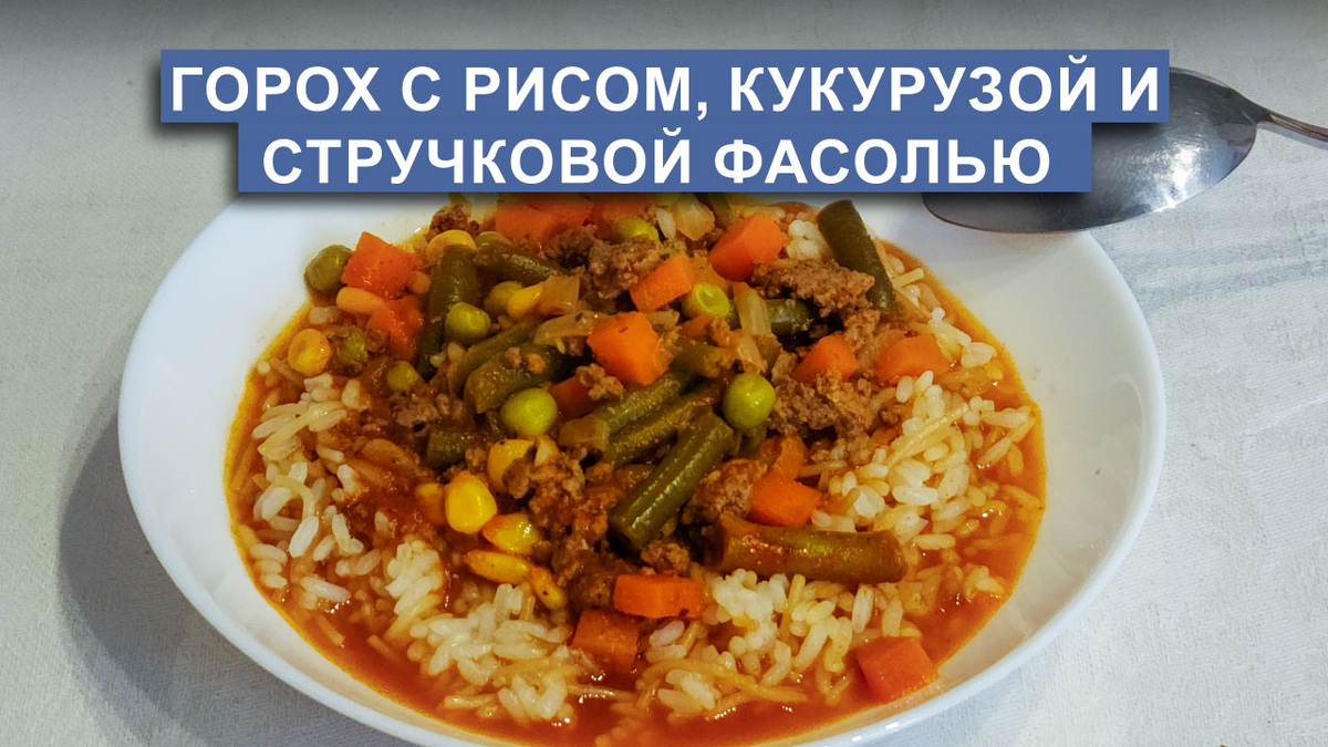 Горох с рисом, кукурузой и стручковой фасолью (на 4 порции | Время готовки: 45 минут) 📝 Ингредиенты: 🥘 Для рагу: 🍚 Для риса: 👩🍳 Способ приготовления: 1. Готовим рагу (в одной кастрюле): 2. Готовим рис (отдельно): 3. Подача: