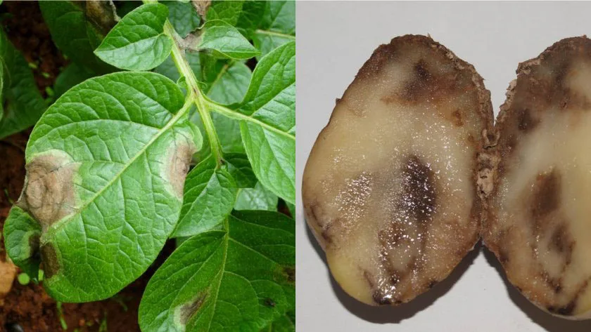 Описание: Фитофтороз — это грибковое заболевание, вызываемое патогеном Phytophthora infestans. Оно поражает как надземные части растения, так и клубни.