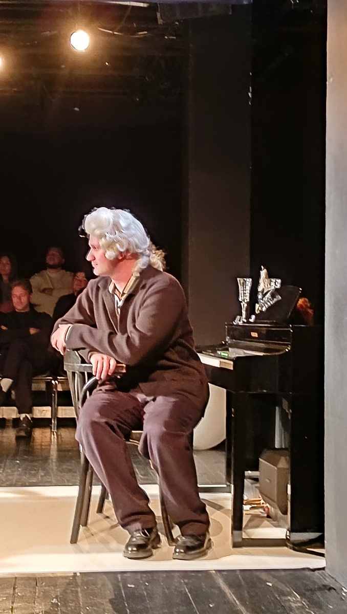 Режиссёр - Иван Титов Театр Москвы даёт абсолютную свободу актёрам, режиссёрам и зрителям. Из нескольких постановок в афише я выбрала спектакль "Моцарт" - сценическую композицию о гениальном австрийском композиторе, вундеркинде, сочинившем первую симфонию пяти лет от роду, первую оперу в 14 лет, молва о чьей виртуозности обошла всю Европу. Сегодня Амадей("поцелованный Богом") говорит со зрителями не милым зальцбургским акцентом, а простым русским языком без всяких "сир" и "герр". В постановке вы не увидите помпезных костюмов и декораций - цвет спектакля будет чёрно-белым. Вы не услышите музыку гения, лишь в начале спектакля взрослый Амадей примерит на себя напудренный парик с буклями, да и снимет его. В действии будет всё чётко и по теме: 9 дней из жизни великого композитора, 9 дат на экране вверху сцены. 10 декабря 1766,Зальцбург 13 января 1775, Милан 17 ноября 1780, Зальцбург 7 февраля 1781, Вена 20 апреля 1790, Вена 20 октября 1790, Вена Световые штрихи разрывают темноту зрительн