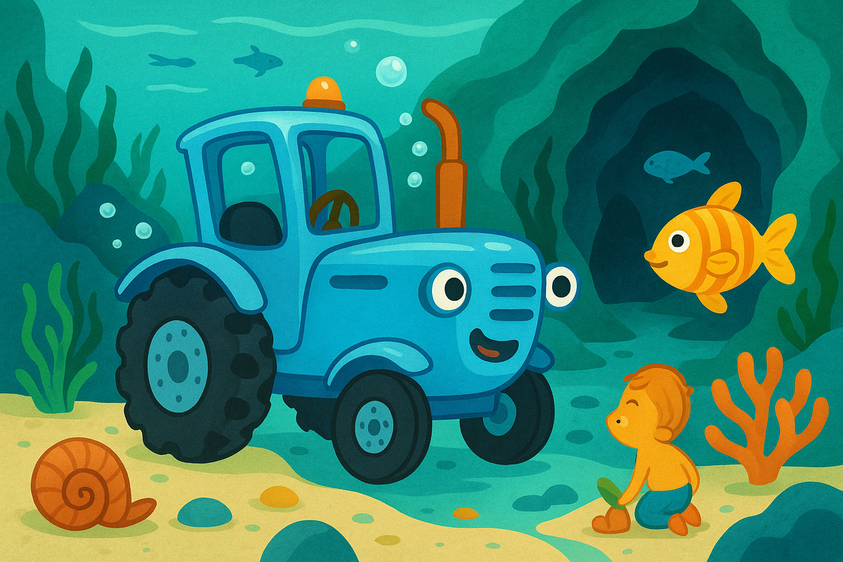 На весёлой ферме, где всегда звучит смех и щебетание птиц, жил Синий Трактор. Он был помощником, певцом и настоящим другом для всех зверят и растений. Но больше всего на свете он любил исследовать мир - кататься по лугам, лесам, даже по горам. Однажды случилось нечто совершенно неожиданное… Глава 1. Прыг-скок в реку Был тёплый летний день. Синий Трактор помогал на ферме: возил сено, доставлял морковку, поливал огурцы. - Уф-ф-ф, жарко! - сказал он, останавливаясь у реки. Река тихо журчала, манила прохладой. Вдруг Трактор заехал слишком близко… и поскользнулся на мокром камешке! - Уууупс! - крикнул он. Бульк! - и Синий Трактор оказался в воде! Но вместо того чтобы утонуть… он начал преображаться! Колёса превратились в плавники. Фары засияли, как подводные фонарики. Его мотор начал мурлыкать, как мурена. Он стал… ПОДВОДНЫМ ТРАКТОРОМ! Глава 2. Знакомство с подводным миром Сначала Трактор испугался: - Где мои поля? Где ферма? Где Петя-петух? Но потом заметил вокруг настоящий подводный город