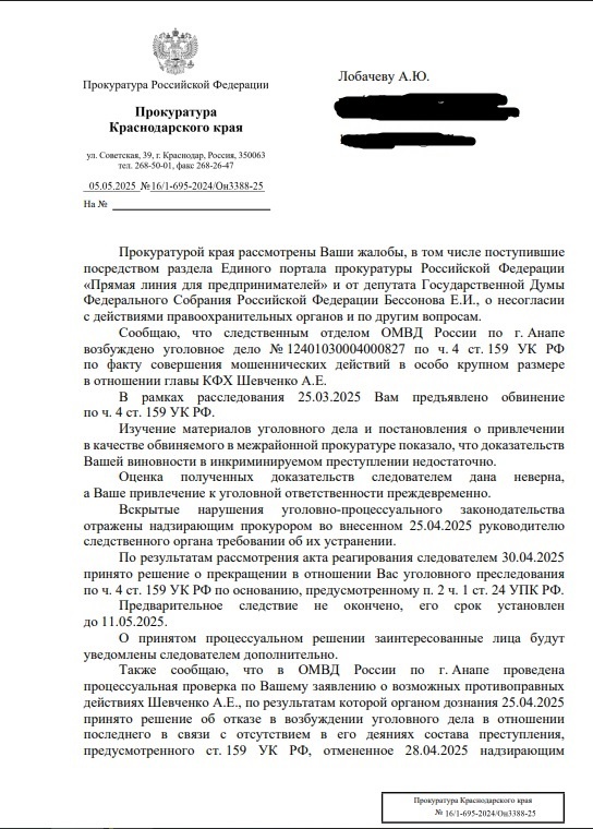 По результатам рассмотрения акта реагирования следователем 30.04.2025 принято решение о прекращении в отношении Вас уголовного преследования по ч. 4 ст. 159 УК РФ по основанию, предусмотренному п. 2 ч. 1 ст. 24 УПК РФ. Предварительное следствие не окончено, его срок установлен до 11.05.2025...»