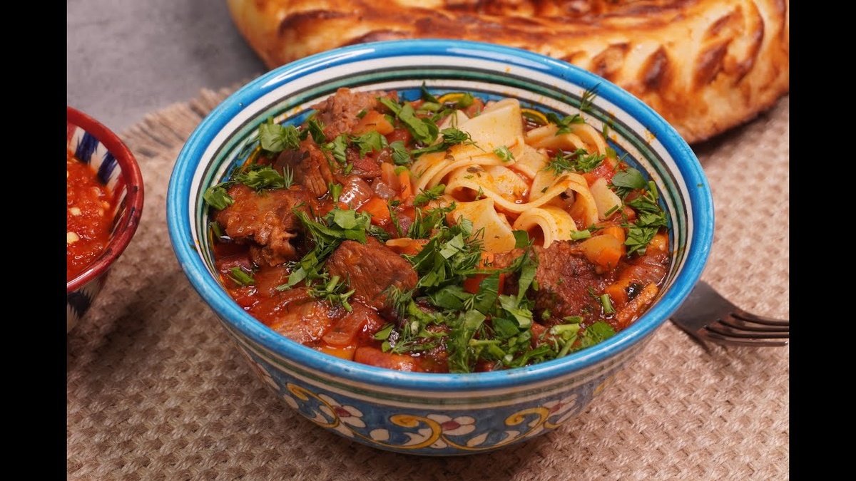Лагман — традиционное блюдо среднеазиатской кухни, особенно популярное среди уйгуров, дунган и узбеков. Представляет собой густое мясо-овощное рагу с длинной лапшой, приготовленной вручную. Основные ингредиенты лагмана включают говядину или баранину, овощи (морковь, редька, картофель, перец, лук), специи и свежую зелень. Лапша готовится отдельно и подается вместе с мясным соусом. Ингредиенты: - Говядина или баранина — 500 г - Морковь — 2 шт. - Редька черная — 1 шт. - Картофель — 2–3 шт. - Болгарский перец — 1–2 шт. - Лук репчатый — 2–3 шт. - Чеснок — 3–4 зубчика - Томатная паста — 2 ст.л. - Растительное масло — для жарки - Вода или бульон — около 1 л - Специи: черный молотый перец, зира, кориандр, лавровый лист, соль - Свежая зелень (петрушка, укроп) - Мука пшеничная — примерно 3 стакана - Яйцо куриное — 1 шт. - Соль Приготовление теста для лапши: 1. Просейте муку горкой на столе, сделайте углубление посередине. 2. Добавьте яйцо, немного воды и щепотку соли. Замешивайте тесто руками, п