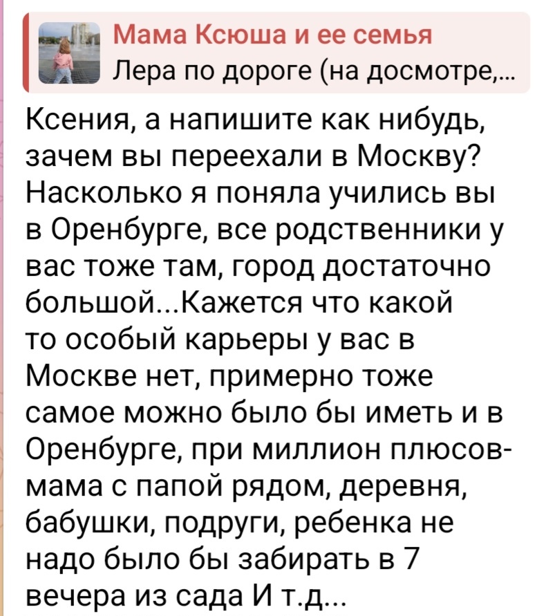 Останься я в родном городе, моя жизнь сложилась бы совсем иначе. У меня была бы отдельная квартира без ипотеки. У меня вероятно были бы те отношения, которые были разорваны как раз по причине моего переезда в Москву, и как знать, что было бы дальше. У меня были бы рядом все родители, родственники, подруги детства.