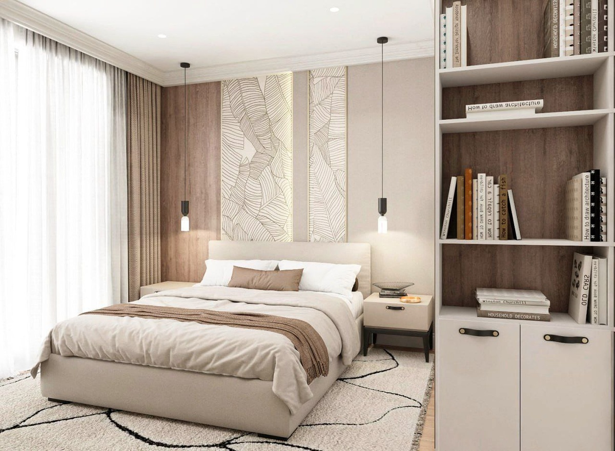 За изголовьем кровати - популярные нынче "бамбуковые" панели.