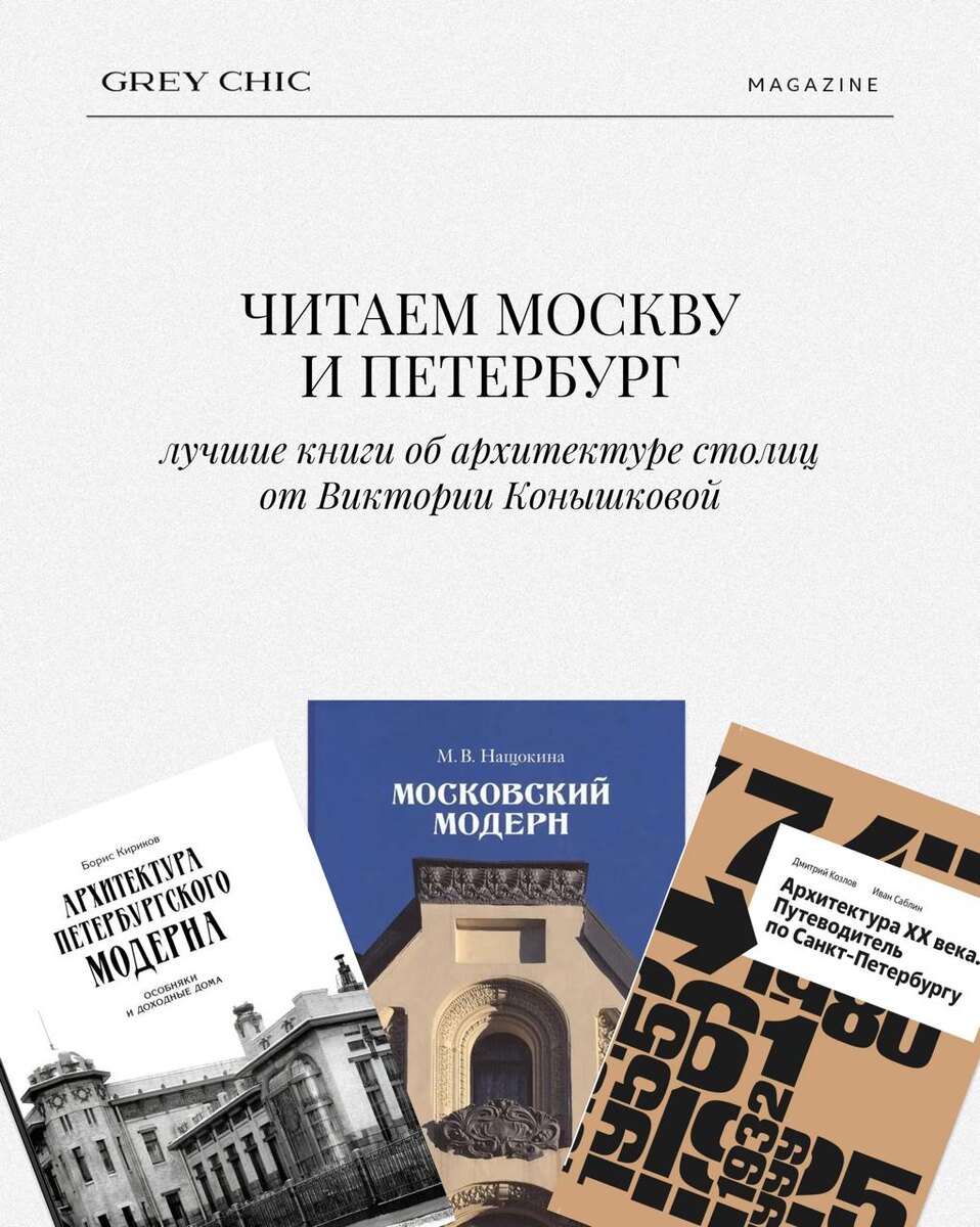 Две столицы — такие похожие и такие разные. Москву и Петербург часто сопоставляют — по архитектуре, жителям, темпу. Виктория Конышкова, художница и исследовательница дореволюционной архитектуры, советует лучшие книги о наших любимых городах. Москва: 1. М. В. Нащокина «Московский модерн»: самое полное описание московских построек в «новом стиле». В каком-то смысле ее можно воспринимать как путеводитель, чтобы потом воочию насладиться самыми красивыми зданиями столицы. 2. А. Мархотин «Москва. Чувства в деталях»: фотокнига, которая поможет вам рассмотреть то, что обычно ускользает от глаз спешащего прохожего. 3. «Новейшая архитектура Москвы. Справочник-путеводитель»: откройте для себя современную архитектуру столицы с профессиональной точки зрения, увидев в ней много нового. Петербург: 1. Трехтомник Б. М. Кирикова про петербургский модерн: один из самых фундаментальных трудов на эту тему, который показывает нам весь спектр архитектуры рубежа веков в северной столице. Более подробно