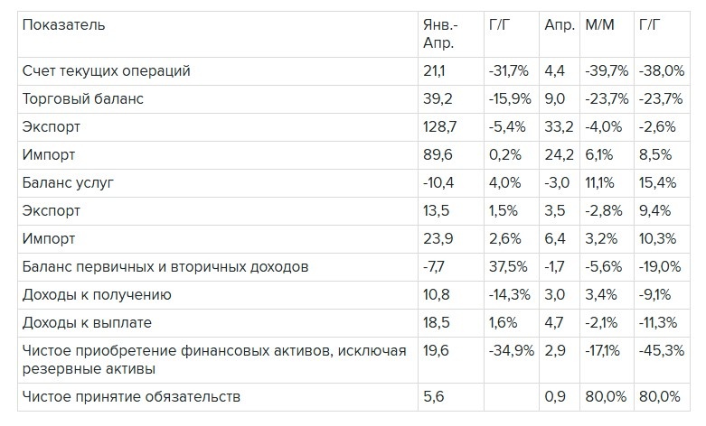 Дискуссию о том, что происходит с курсом рубля, можно продолжать бесконечно. В частности, больше всего интересует, насколько велика сейчас в этом курсе доля искусственного удержания, назовем это так, насколько он отражает реальную ситуацию со спросом и предложением валюты? Мне самому очень хотелось бы знать точный ответ на этот вопрос, но его никто не дает, поэтому можно лишь рассуждать, опираясь на те данные, которые известны, в поисках ответа (чем я, собственно, и занимаюсь). И выходящие все новые данные дают на этот счет противоречивую информацию. В частности, сегодня вышла информация по внешней торговле за апрель и за январь-апрель от Центробанка. Там по всем параметрам не просто падение, а сильное падение профицита торгового баланса. В частности, профицит счета текущих операций (отражающий состояние внешней торговли) за первые 4 месяца текущего года сократился на 31,7% в годовом выражении, а конкретно в апреле - на 39,7% по отношению к марту. Экспорт товаров за 4 месяца упал на 5,