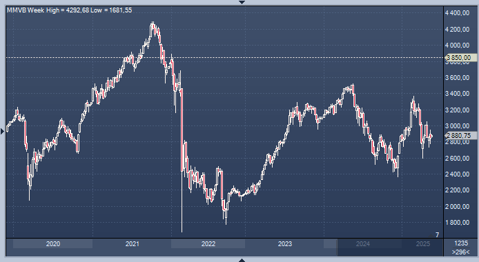 Альфа-банк ждёт роста индекса Мосбиржи на 15-30% за 12 месяцев, до 3350-3850пп График индекса Мосбиржи интервалами в 1 неделю В своём прогнозе на второе полугодие 2025 года эксперты проанализировали перспективы IMOEX, рассмотрев два возможных сценария. В оптимистичном сценарии, основанном на целевых ценах отдельных бумаг с учётом их доли в структуре IMOEX, потенциал роста индекса оценивается в 30%. В пессимистичном сценарии ожидаемый потенциал роста значительно ниже. Аналитики рассчитали средневзвешенное значение мультипликатора P/E за период с января 2017 года по декабрь 2021 года, получив 5,0х. «Если исходить из форвардного мультипликатора P/E на 2025 год (4,6х) и прогнозируемой инфляции (7%), то потенциал роста IMOEX составит не менее 15%», — отмечают аналитики Альфа-банка. Эксперты Альфа-банка сохраняют нейтральную оценку перспектив российского рынка акций до конца второго квартала 2025 года. Они предполагают, что индекс IMOEX останется в диапазоне 2800–3000 пунктов. «На него будут