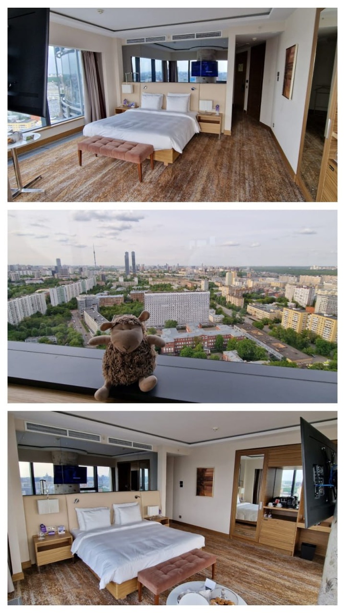 Проходим в комнату. Окна от пола до потолка, много света и фантастическая панорама на столицу: вид от знаменитых сталинских высоток до Сити, от Останкино до Сокольников. Впечатляет! В центре огромная кровать, в углу кресло и стол с вэлком-подарком (печенье, орешки, сухофрукты). Напротив, рабочая зона, небольшой шкаф, чайно-кофейная станция и пустой мини-бар 🤷♂️ SPA в отеле строится со дня открытия 😂, поэтому зависнуть на долго в самом отеле не получится. Но это и не требуется - на улице отличная погода, а прямо через дорогу, в минуте ходьбы, есть Екатерининский парк. Недолго думая, туда мы и отправились. #radissonolympiyskiy