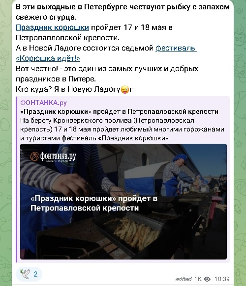 На прошлой неделе выкладывала анонс празднования Дня корюшки в своем телеграмм-канале Сказано - сделано! Почему в Новую Ладогу, а не на Петропавловку? Я неделю назад вернулась из Вьетнама. Честно говоря, устала от толп. С ужасом представила что будет твориться в городе на празднике и решила....... к тетке, в глушь, в Саратов лучше к друзьям в Новую Ладогу. Кстати, туда можно выбраться хотя бы на выходные и если вас не позвали в гости. Наконец-то стали появляться объекты, где можно остановиться Да у меня был и шкурный интерес - хотела сыра на ярмарке прикупить. Частные сыроварни привозят свою продукцию и на питерские ярмарки, и на значимые фестивали в области. Понадеялась что в глубинке будет подешевле. Эх, зря понадеялась. Но об этом попозже. Сначала о самом празднике. "Корюшка идет!" празднуется в Н.Ладоге уже в 7-й раз. Пару раз и я там бывала до этого. В этом году гораздо меньше зрелищ, но больше хлеба Традиционные мастер-классы прошли только на одной локации, к которой было не проб