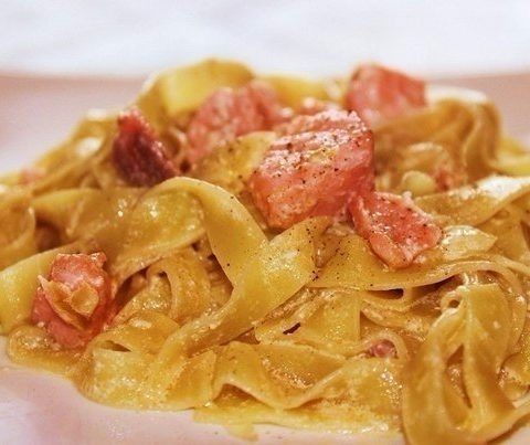 Фетучини один из типов итальянской пасты, популярный в Риме. Фетучини — это тонкие плоские полоски теста шириной около 7 мм: они похожи на тальятелле, от которых отличаются только большей шириной. Одним из самых популярных блюд с использованием фетучини является фетучини Альфредо. Популярность этого блюда привела и к более широкому распространению фетучини, как разновидности пасты. 1. Семгу нарезаем кубиками.