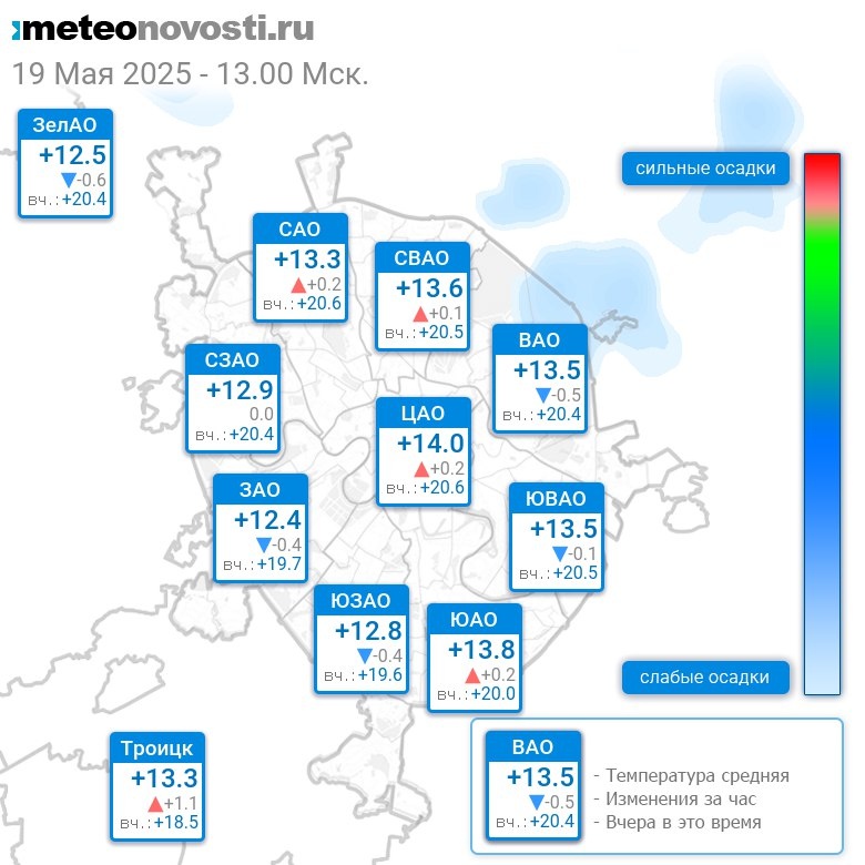 В 13:00 в Москве было от +12.4°C до +14.2°C, средняя температура +13.4°C #погода #Москва #весна #температура #19мая #понедельник