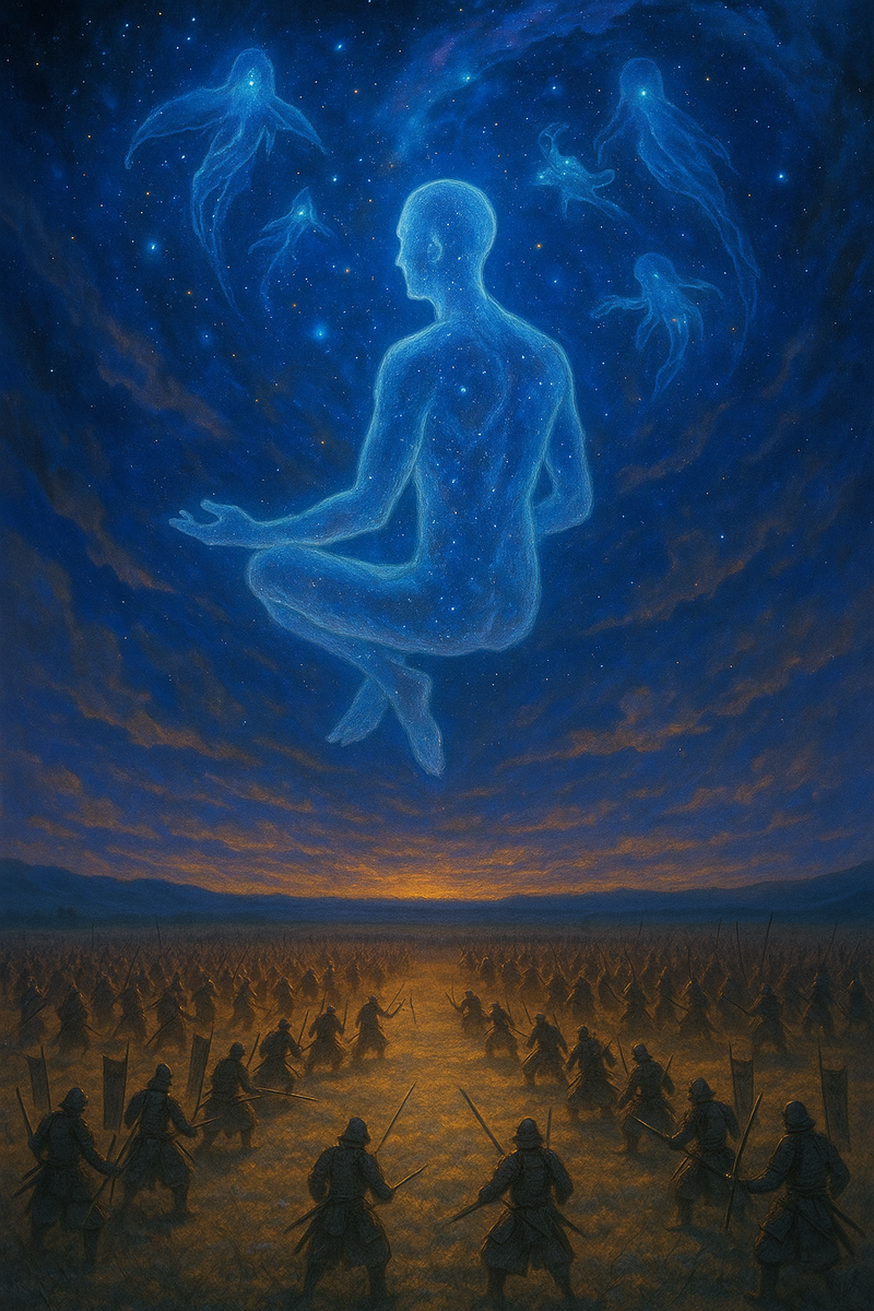 Словно невидимая нить вела его к земле. Приблизившись, он увидел две огромные армии самураев, стоящих друг напротив друга в бескрайнем поле. Ветер нес запах войны, и в воздухе витало напряжение. В один момент из рядов обеих армий вышли два командира — они были готовы сразиться в поединке, от исхода которого зависела судьба их воинов и войны в целом. Мечтатель осознал, что может перемещаться не только в пространстве, но и во времени. Он стал свидетелем того, как история разыгрывалась на его глазах.