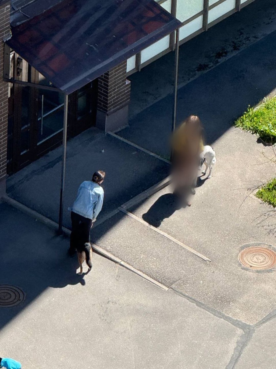 Женщина в джинсовой куртке, её собака подошла без признаков агрессии, но налетела на собаку на поводке другого человека. Женщине было довольно сложно поймать своё животное.