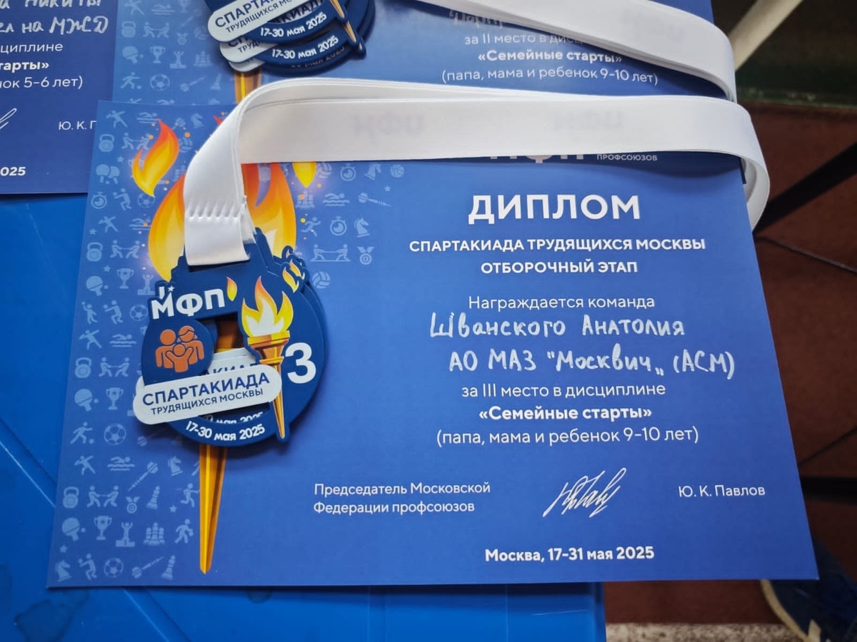 - Семья Даниила Горячкина (папа и ребёнок 7-8 лет) также стала бронзовым призёром в своей группе Соревнования в рамках Спартакиады проходили по пяти дисциплинам: плавание, лёгкая атлетика, шахматы, дартс и семейные эстафеты. Именно в последней категории профсоюзные семьи АО МАЗ "Москвич" показали прекрасные результаты, продемонстрировав не только спортивную подготовку, но и настоящую семейную сплочённость. "Участие в таких мероприятиях - это прекрасная традиция, которая объединяет трудовые коллективы и укрепляет семейные ценности, - от