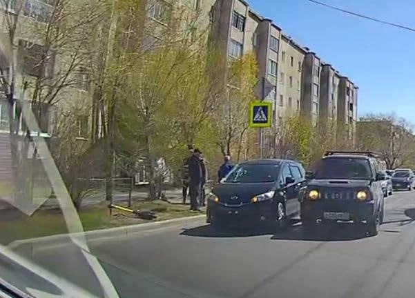 Около ТЦ «Новосити» сбили мужчину на электросамокате. В ГИБДД сообщили, что самокатчика сбила «Тойота» на пешеходном переходе. Был пострадавший на нем или катил его рядом, неизвестно. Экипаж выехал на место. Из-за аварии на Журавлева образовалась пробка. Фото из тг-канала «ЧП Чита — Происшествия Забайкалья» 🟦 Подписаться