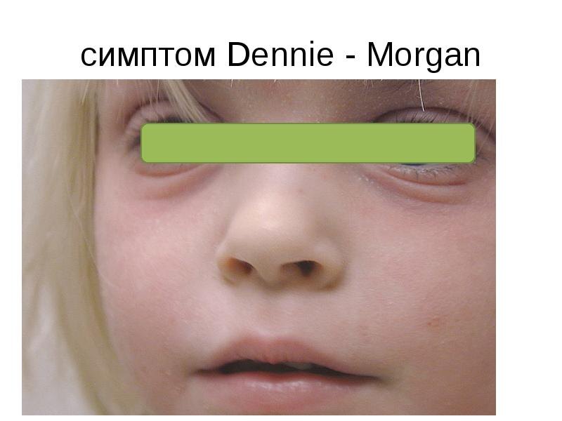 Или СИМПТОМ МОРГАНА, СИМПТОМ ДЕНЬЕ - МОРГАНА. Профессиональная деформация врачей-диагностов заключается в том, что они, глядя в лица окружающих их людей, машинально отмечают те или иные признаки, которые могут быть симптомами конкретных заболеваний. СКЛАДКА ВЕРАГУТА, ЛИЦО КОРВИЗАРА, синеватый или коричневатый цвет кожи под глазами, прыщи, пигментные пятна, родинки, бородавки, асимметричный прикус, обветренные губы... Самое интересное, что некоторые признаки могут существовать сами по себе, то есть нос картошкой - это просто нос картошкой, а не показатель низкого IQ в результате наличия лишней хромосомы. Но иногда они свидетельствуют о реальном наличии проблем. Например, углубленные морщинки на нижних веках у детей, которые называются СКЛАДКАМИ ДЕННИ - МОРГАНА, вполне могут быть просто этнической/генетической особенностью, однако в ряде исследований утверждается, что их наличие свидетельствует о заболевании атопическим дерматитом и может быть использовано в качестве диагностического м